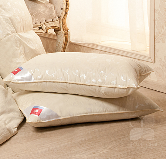 Подушка выпускается в двух вариантах цвета: небесно-голубой и теплый — шампань из пуходержащего тика, по периметру отделка шелковым кантом, оттеняющим его своим блеском.