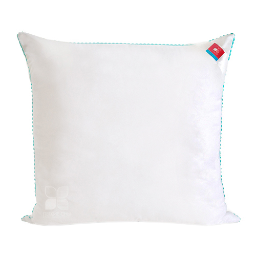 Важно заметить, что синтетический пух столь же лёгок и приятен на ощупь, как и его натуральный прототип. Чехол подушки выполнен из микрофибры (100 % полиэстр) белого цвета с тиснением страйп или волны, отделка по краю подушки кантом зиг-заг бирюзового цвета, фирменная упаковка конверт ПВД, спанбонд.